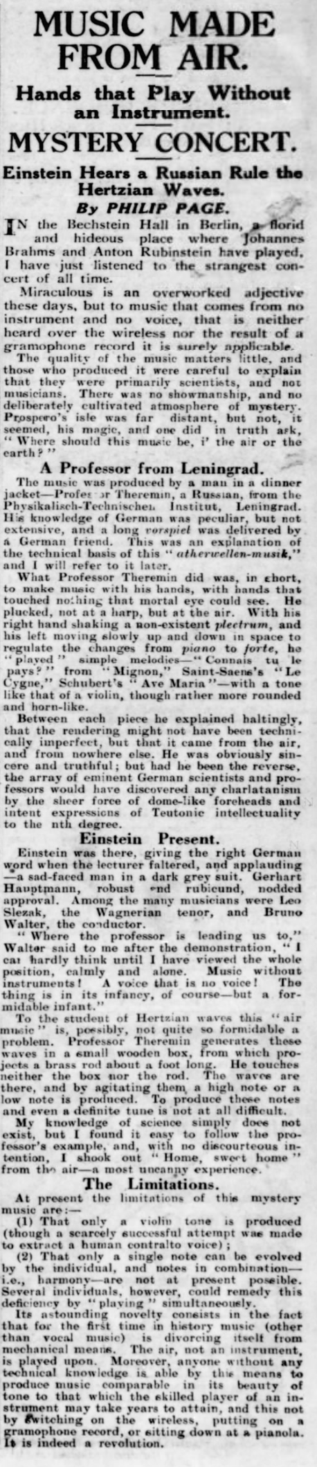 The theremin, invented by Russian physicist and musician Leon Theremin in 1920, produces eerie and ethereal sounds, which intrigued the audience, including Einstein. According to Philip Page in the Evening Standard, the concert emphasized the science behind the music and avoided theatrical showmanship. The audience was comprised of various luminaries, such as Gerhart Hauptmann, Leo Slezak, and Bruno Walter.